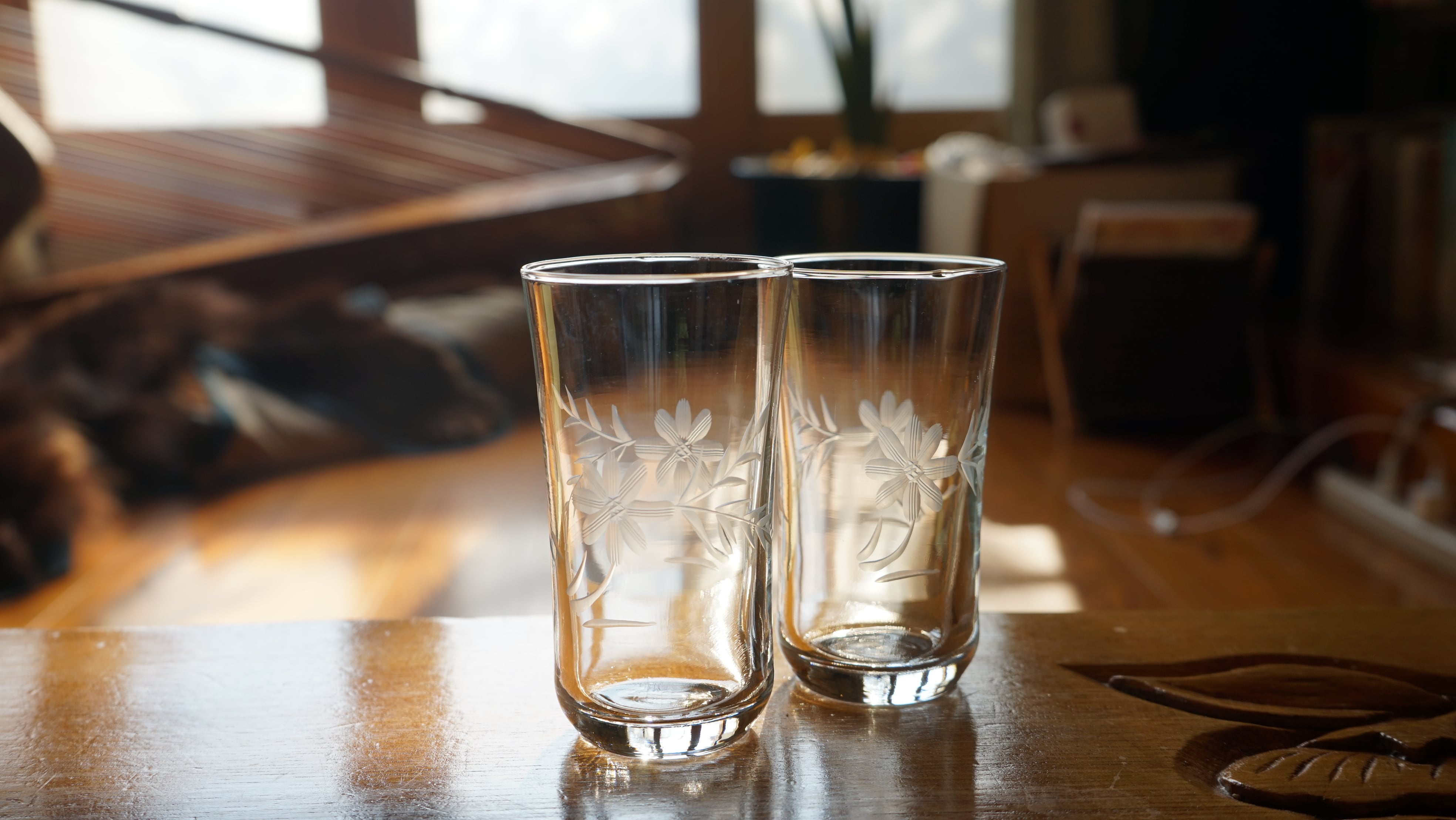 お花の模様が入った切子グラス。 花柄もですが、昔の不均一でゆらぎがあるガラスがなんとも愛らしい。 サイズ(1つあたり):直径約6センチ、高さ約11.5センチ 古いものですので、細かな傷等ありますことと、 交換、返品は対応できかねますことを、予めご了承ください。